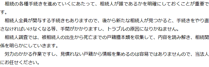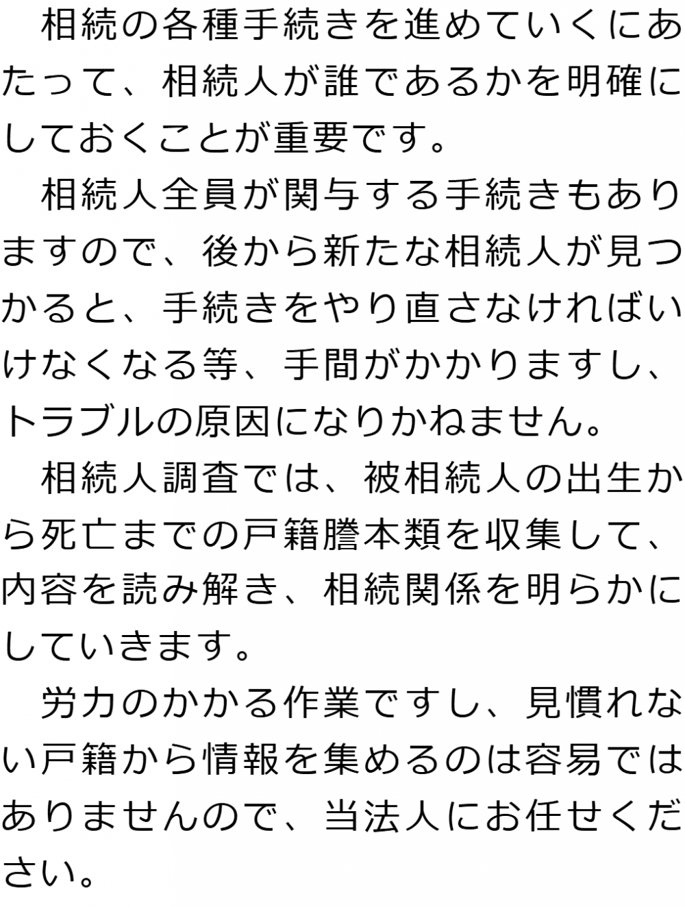 トップ業務内容相続人調査 階層構造▼ 業務内容(目次) 相続人調査 業務内容(目次)業務内容トップ行政書士法人心の業務内容遺言遺産整理相続人調査相続財産調査遺産分割協議書の作成預金・貯金の解約・名義変更証券口座の解約・名義変更自動車の名義変更心グループのその他の業務内容家族信託・民事信託節税対策事業承継遺言の検認相続放棄限定承認遺産分割遺留分侵害額請求相続登記相続税申告相続税調査 受付時間 平日 9時~21時、土日祝 9時~18時 夜間・土日祝の相談も対応します (要予約) 所在地 〒510-0075 三重県四日市市安島1-2-29MIZUTAMIビル3F 0120-2403-39 お問合せ・アクセス・地図