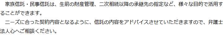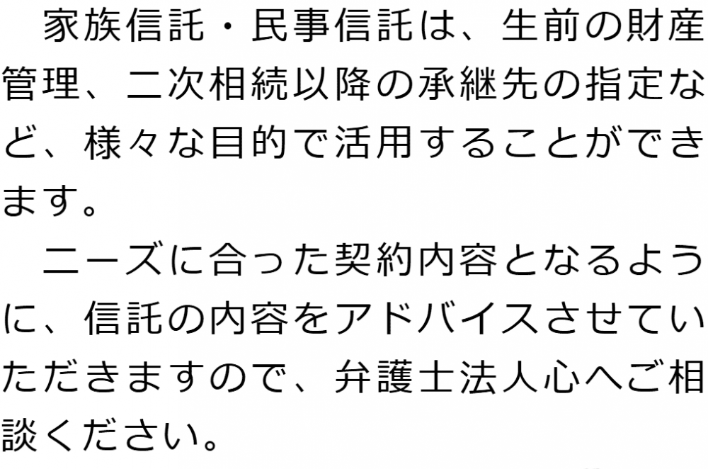 トップ業務内容家族信託・民事信託 階層構造▼ 業務内容(目次) 家族信託・民事信託 業務内容(目次)業務内容トップ行政書士法人心の業務内容遺言遺産整理相続人調査相続財産調査遺産分割協議書の作成預金・貯金の解約・名義変更証券口座の解約・名義変更自動車の名義変更心グループのその他の業務内容家族信託・民事信託節税対策事業承継遺言の検認相続放棄限定承認遺産分割遺留分侵害額請求相続登記相続税申告相続税調査 受付時間 平日 9時~21時、土日祝 9時~18時 夜間・土日祝の相談も対応します (要予約) 所在地 〒510-0075 三重県四日市市安島1-2-29MIZUTAMIビル3F 0120-2403-39 お問合せ・アクセス・地図