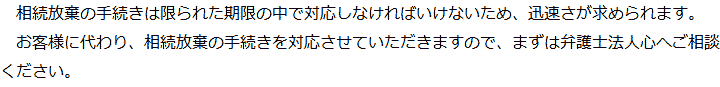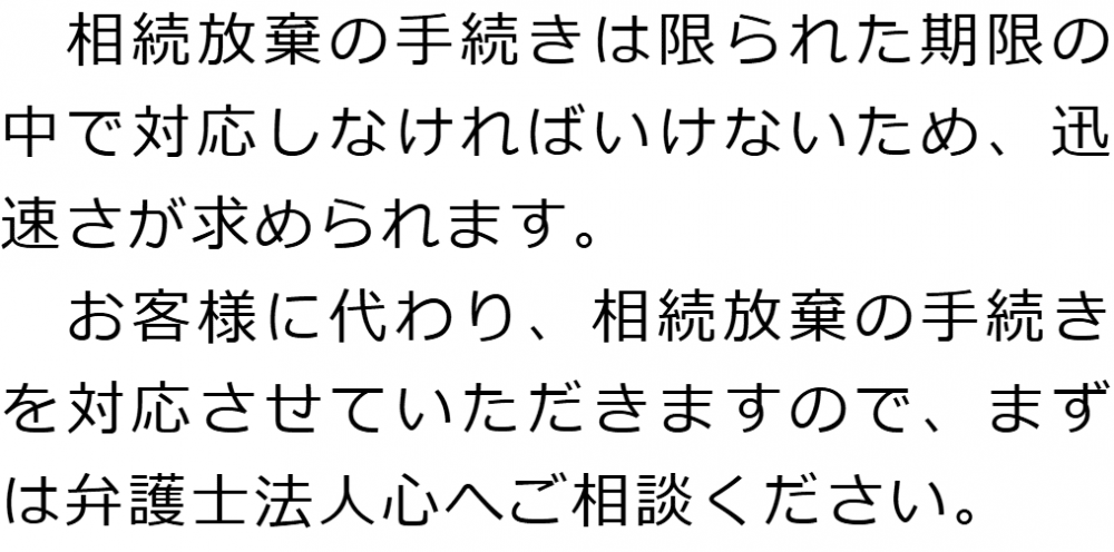 トップ業務内容相続放棄 階層構造▼ 業務内容(目次) 相続放棄 業務内容(目次)業務内容トップ行政書士法人心の業務内容遺言遺産整理相続人調査相続財産調査遺産分割協議書の作成預金・貯金の解約・名義変更証券口座の解約・名義変更自動車の名義変更心グループのその他の業務内容家族信託・民事信託節税対策事業承継遺言の検認相続放棄限定承認遺産分割遺留分侵害額請求相続登記相続税申告相続税調査 受付時間 平日 9時~21時、土日祝 9時~18時 夜間・土日祝の相談も対応します (要予約) 所在地 〒510-0075 三重県四日市市安島1-2-29MIZUTAMIビル3F 0120-2403-39 お問合せ・アクセス・地図